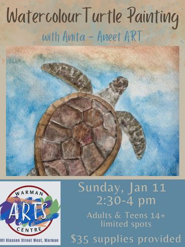 On Sunday January 11th Anita from Aneet Art will guide you through the steps to paint this lovely turtle in watercolours. This class is for participants age 14 and older. Seats are limited. $35.00 per person and all supplies are included.