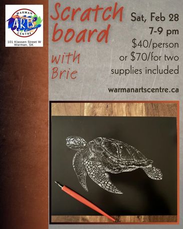 On Saturday February 28th at 7:00 pm Brieanne Froese will lead you through a class where you will learn how to create this turtle using scratchboard techniques. Cost is $40 per person with all supplies included, OR $70 for two people. Open to everyone age 15 and older. Register now!