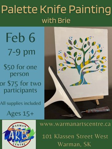 Here's your chance to try palette knife painting with art teacher Brieanne Froese. Sign up now to save your seat on Feb. 6th. $50 for one ticket or $75 for two! Supplies included. For participants age 15 and older.