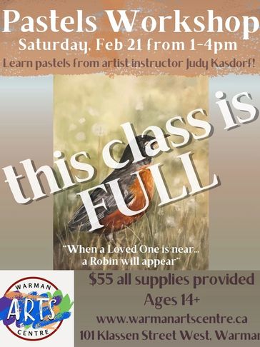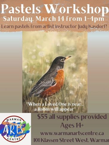 Enjoy this soft pastels class with Judy Kasdorf on Saturday March 14th. "When a loved one is near, a robin will appear." The cost is $55 per person, with all supplies included. For participants age 14 and older.