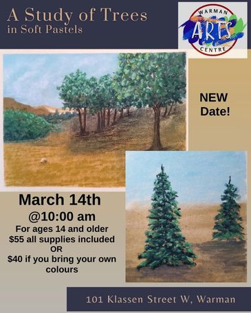 Date Change! Mar. 14th join Angie P. to practice how to create trees. This is an instructional class where you will learn techniques to create trees in the distance, mid-ground and foreground. These steps apply to pastels and acrylic painting. Cost is $55 per person, with pastel supplies included, OR $40 if you bring your own colours (pastels or acrylics). Seats are limited.