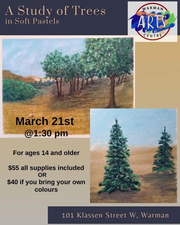 March 21st at 1:30pm join Angie P. to practice how to create trees. This will be a very instructional class! You will learn the techniques to create trees in the distance, mid-ground and foreground. These steps apply to pastels and acrylic painting. Cost is $55 per person, with all pastel supplies included, OR $40 if you bring your own colours (pastels or acrylics). Seats are limited.